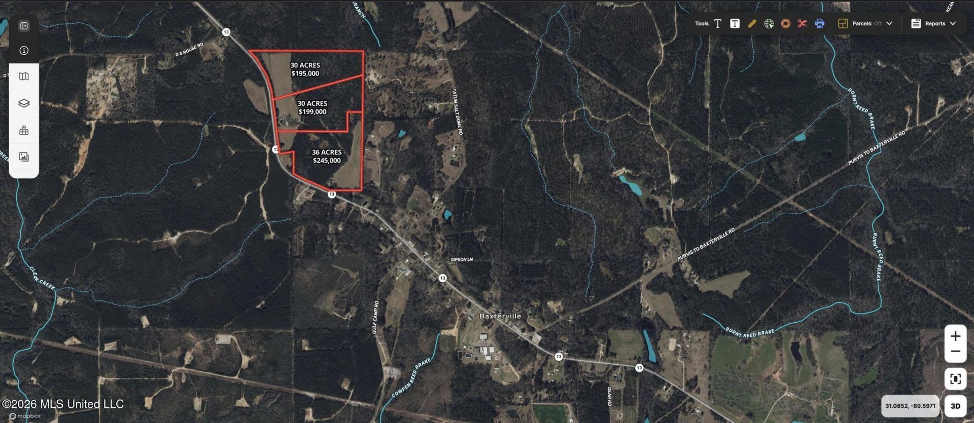 30+/- acres of some of the prettiest land you will find in Lamar County. This property is ready for your dream home. Situated on Highway 13 just outside of Baxterville, it features a nice privacy strip of woods along the frontage that opens up to a beautiful level pasture that has been manicured for hay production for years. The rear half of the property rolls into gently sloping hills with big mature timber that is perfect for hunting. With no restrictions, bring the farm animals and come settle on the homestead of your dreams! Property is situated in the highly sought after Baxterville school district k-6 and then Purvis for highschool! Seller is currently in the process of having the property surveyed and the boundary lines marked